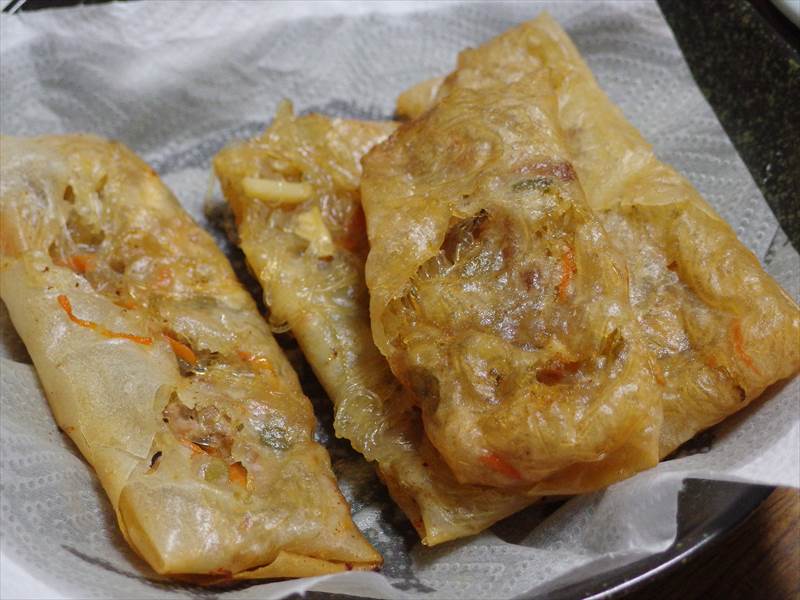 2014-05-10 春巻き大失敗! 自宅飯 具をあんかけっぽくしたため、春巻きの皮が湿ってしまった。結果、皮がパリッと揚がらなかった。最悪なものは皮が破けて、中の具が油を吸って大変なことに。それなら焼いてみればいいんじゃない?ってことで焼いてみたが、まぁ、やっぱり具が失敗しているのでうまいこといかなかった。味は好みなんだけどね、、、
