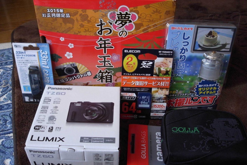 Panasonic の LUMIX DMC-TZ60 と、ケースとかSDカードとかのオプションたちのセット。